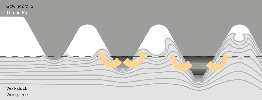 Beim Gewinderollen wird die Gewindeform durch Kaltumformung des Werkstoffs hergestellt. Durch sehr hohen Druck erfolgt eine dauerhaft plastische Verformung des Werkstoffs. Die Gewinderollen verdrängen das Material aus dem Gewindekern und lassen es in Richtung der Gewindespitzen fließen. Dabei wird der Faserverlauf nicht unterbrochen, sondern nur verändert. Das Ergebnis ist ein Gewinde mit hoher Festigkeit, Profil- und Maßgenauigkeit.