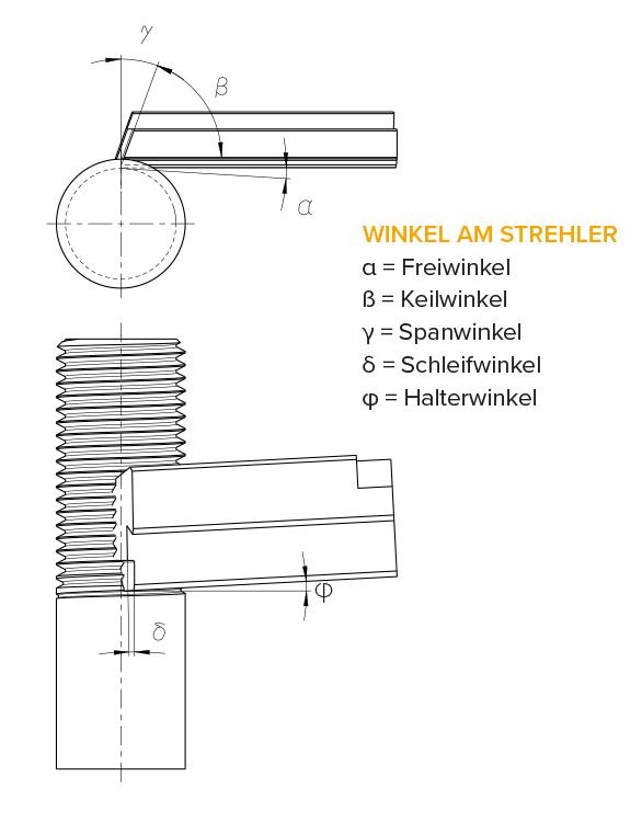 Die Strehlerhalter dienen dazu, die Strehler oder Schälmesser aufzunehmen. Sie sind nach verschiedenen Kerndurchmesserbereichen abgestuft und haben verschiedene Halterwinkel, die dem Steigungswinkel der zu schneidenden Gewinde angepasst sind. Die Gewinde- und Haltertabellen erleichtern die Auswahl des richtigen Strehlerhalters.