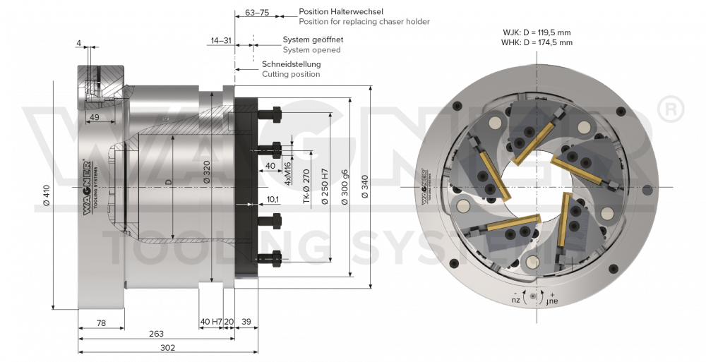 | Trapezoidal and round threads Ø | 24–90 mm |
